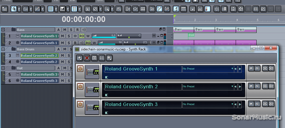 Теперь рассмотрим на конкретном примере использование сайдчейн (sidechain) в SONAR для уменьшения уровня баса во время удара бас бочки
