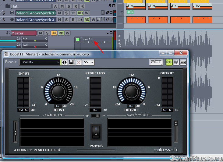 На Master шину я поставил мастеринговый плагин Boost11 для повышения уровня сигнала конечного микса: