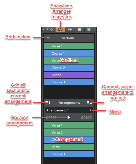 Sections (Секции) - это строительные блоки, из которых состоит песня. Каждый раздел определяет временной диапазон в проекте, например, Intro, Verse, Chorus и т. Д. Аранжировка - это упорядоченный набор секций. Вы можете сортировать разделы в любом порядке, чтобы определить порядок воспроизведения. Для этого перетащите секции из области Sections вниз в область Arrangements в Arranger Inspector.