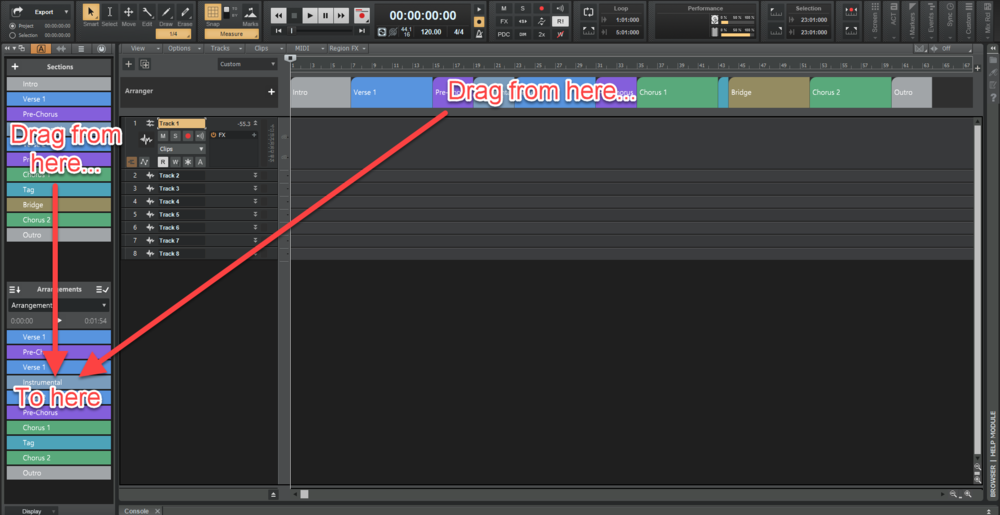 Чтобы определить порядок воспроизведения секций, перетащите секции из списка « Sections» вниз в список « Arrangements» . Вы также можете перетаскивать участки прямо из трека Arranger.