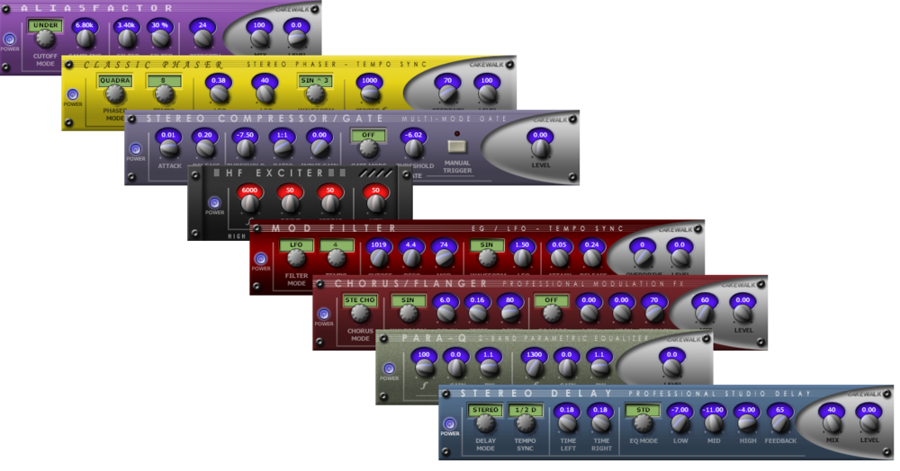Classic Creative Suite состоит из мощных и простых в использовании эффектов Cakewalk, включая Alias Factor, Classic Phaser, Compressor / Gate, HF Exciter, Modfilter, Multivoice Chorus / Flanger, Para-Q и Tempo Delay.