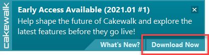 Обратите внимание, что установщики раннего доступа - это установщики обновлений, которые обновляются только с определенной версии. Чтобы установить сборку раннего доступа 2021.01, у вас должен быть последний публичный выпуск 2020.11. Сборку раннего доступа 2021.01 можно загрузить и установить из Cakewalk, выбрав Help > Check for Updates , а затем щелкнув ссылку Download Now в всплывающем уведомлении «Early Access Available».