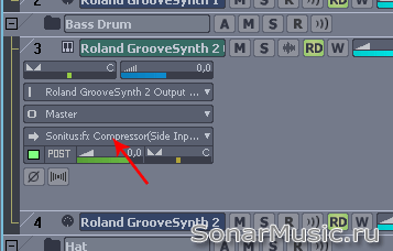 Теперь рассмотрим на конкретном примере использование сайдчейн (sidechain) в SONAR для уменьшения уровня баса во время удара бас бочки