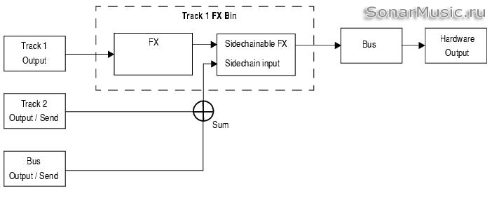 SONAR поддерживает мультивходовые плагины, которые обычно являются сайдчейн (sidechain) плагинами и имеют два входа: главный вход и sidechain вход