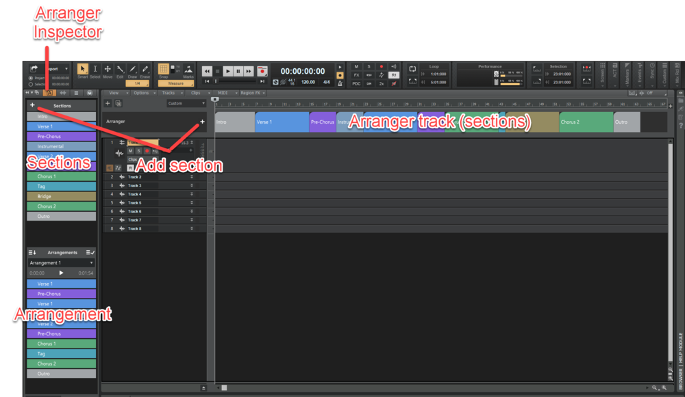 Sections (Секции) - это строительные блоки, из которых состоит песня. Каждый раздел определяет временной диапазон в проекте, например, Intro, Verse, Chorus и т. Д. Аранжировка - это упорядоченный набор секций. Вы можете сортировать разделы в любом порядке, чтобы определить порядок воспроизведения. Для этого перетащите секции из области Sections вниз в область Arrangements в Arranger Inspector.