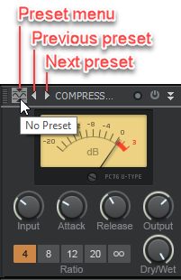 Помимо сохранения предварительных настроек всей цепочки ProChannel (все модули), вы также можете сохранять и загружать предварительные настройки отдельных модулей. Предустановленные элементы управления для каждого модуля расположены на левой стороне панели заголовка каждого модуля.