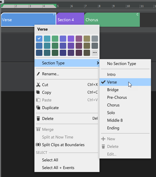 Разделы аранжировщика могут быть назначены дополнительному атрибуту типа раздела, например, Verse , Chorus , Bridge и т. д. Cakewalk включает в себя множество общих типов разделов, и вы можете создавать свои собственные предустановки типов разделов.